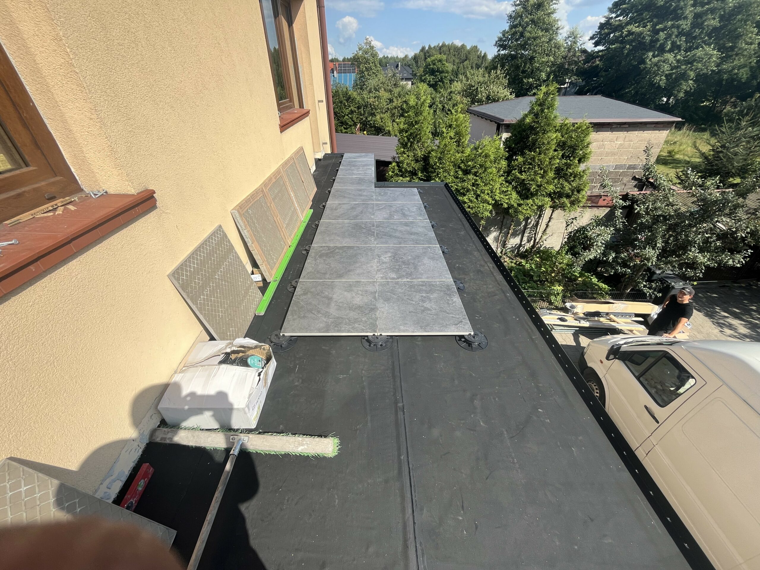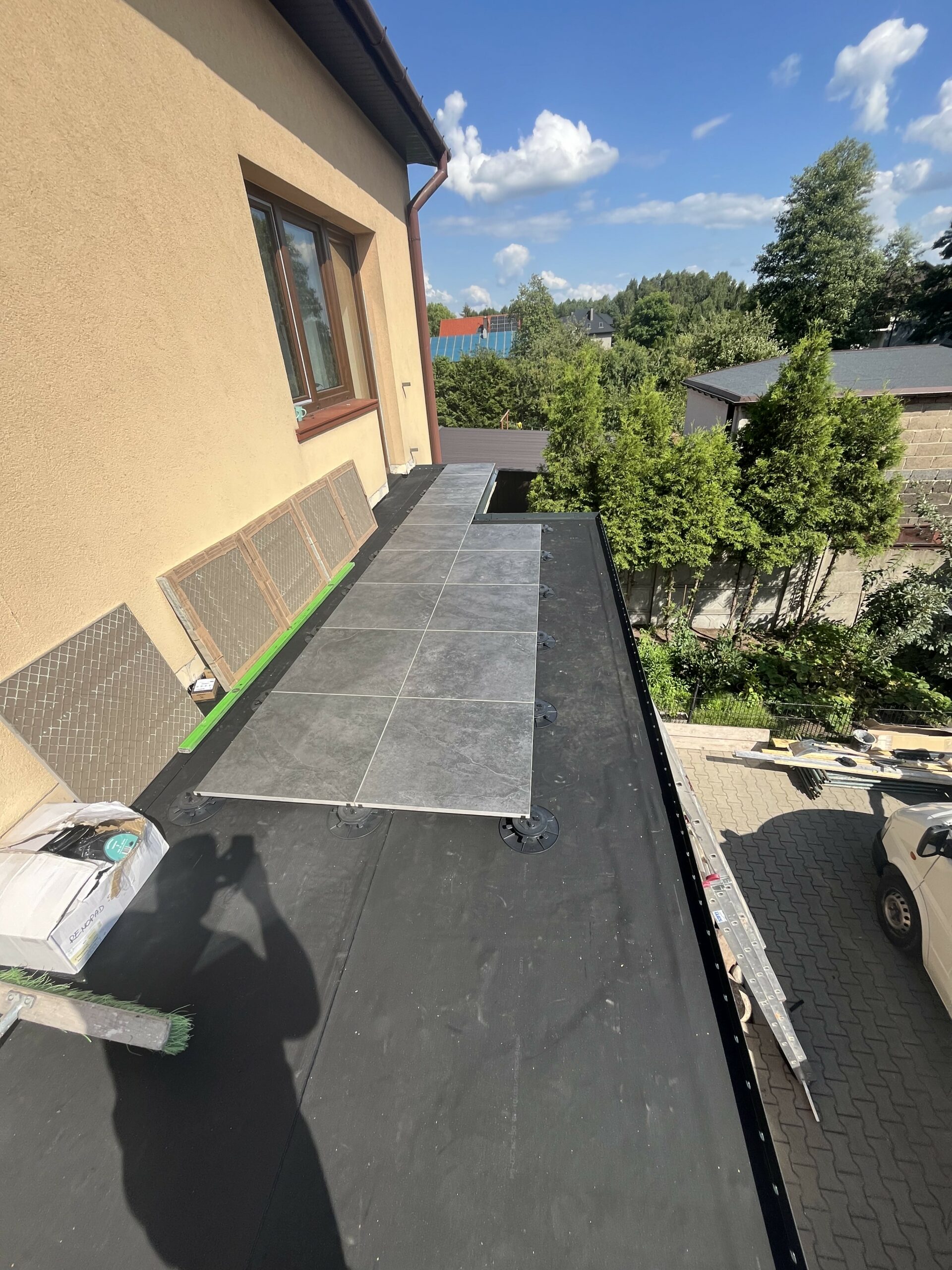 Pełna hydroizolacja tarasu membraną Resitrix EPDM, wraz z montażem płytek gresowych na podstawkach regulowanych.