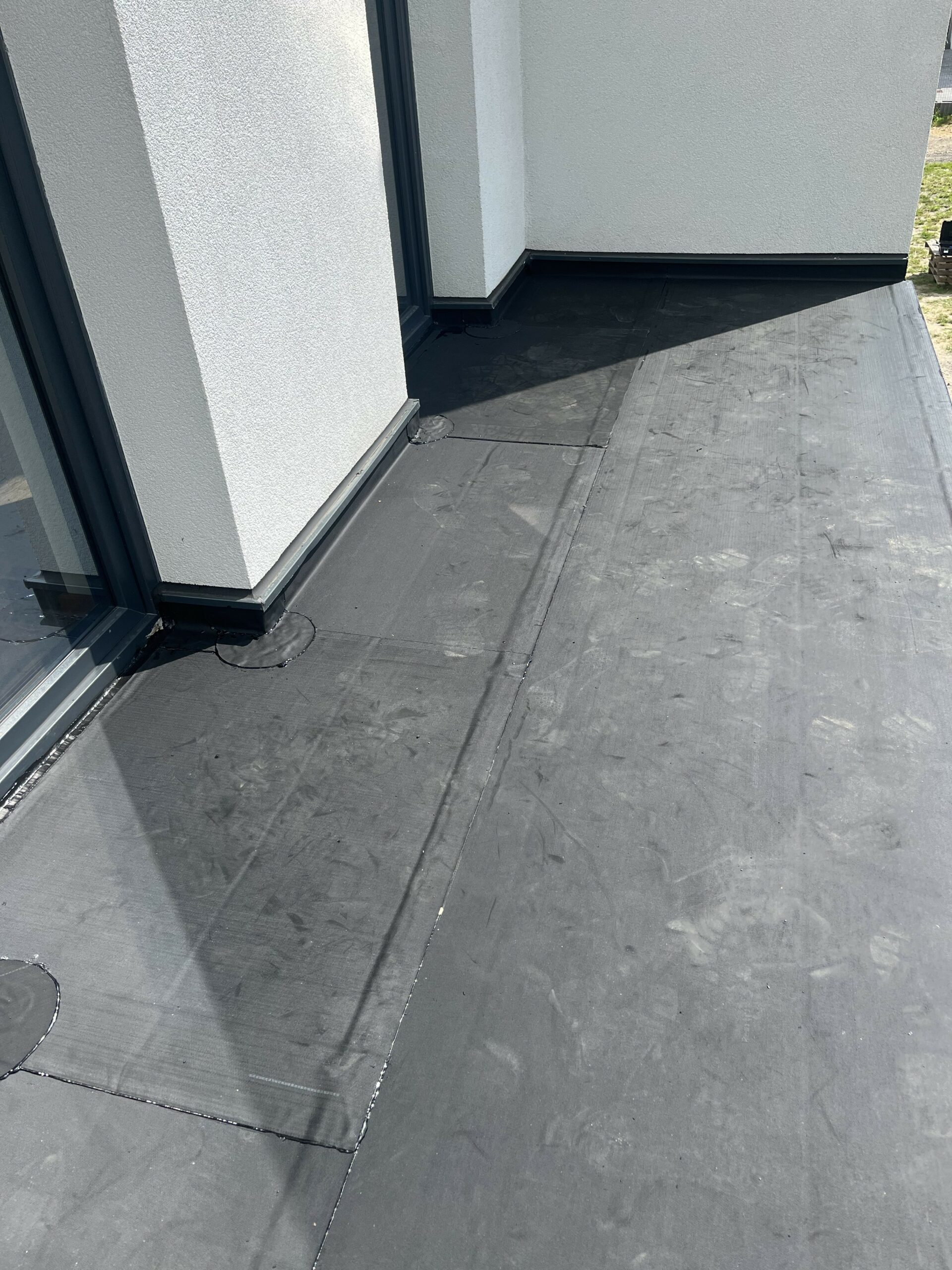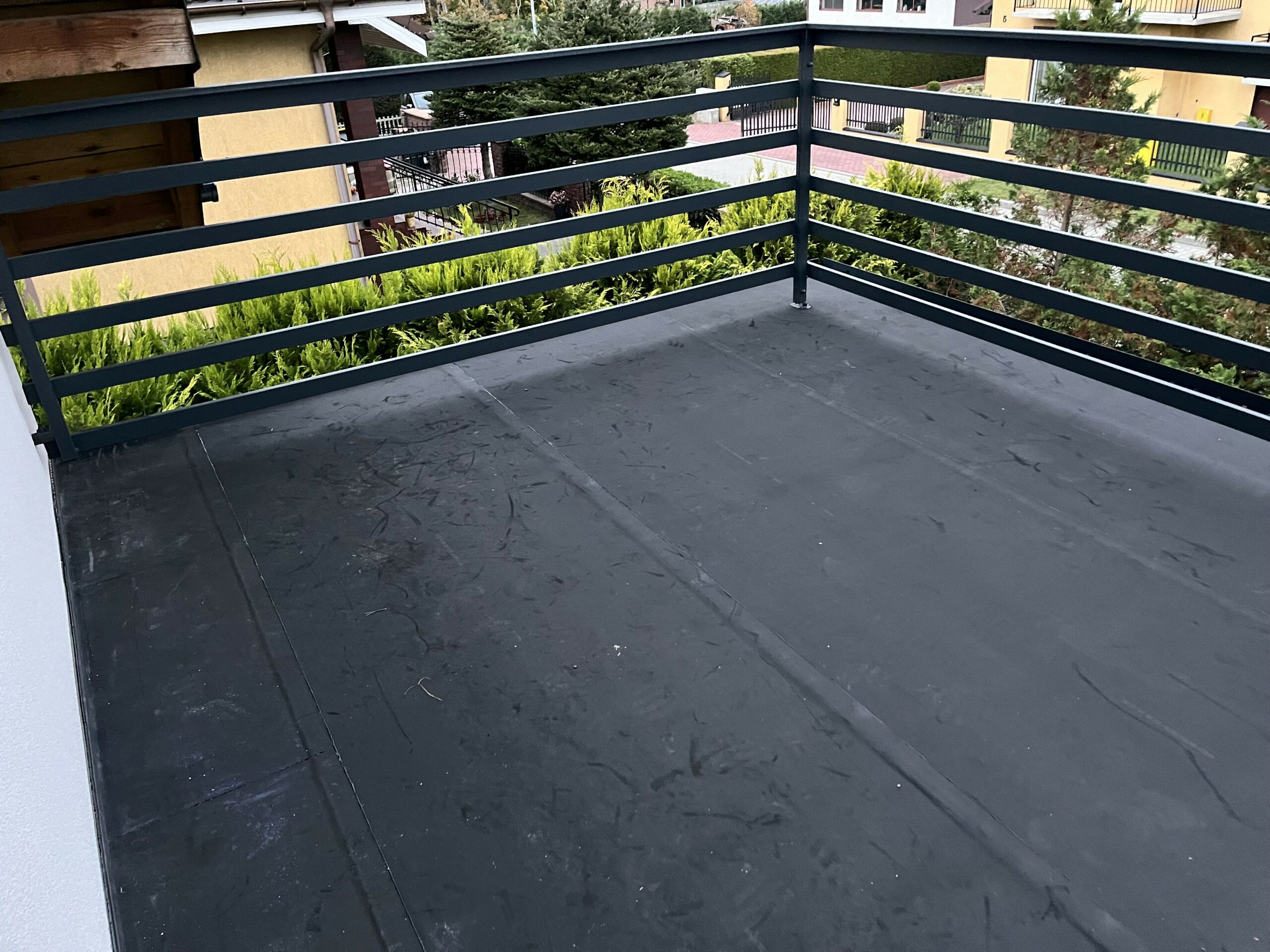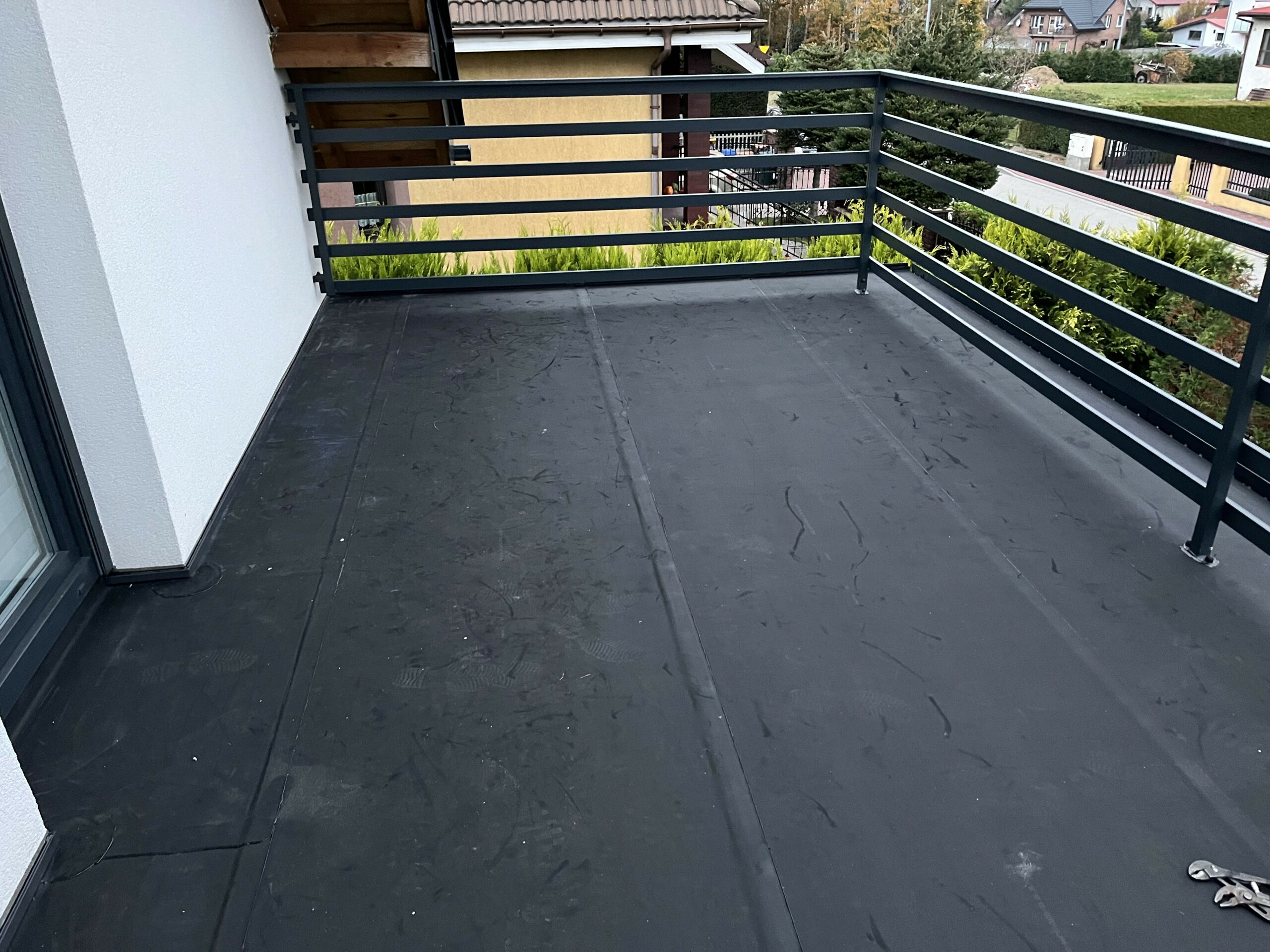 Pełna hydroziolacja balkonu membraną Resitrix EPDM, dodatkowe uszczelnienie opasek przyściennych.